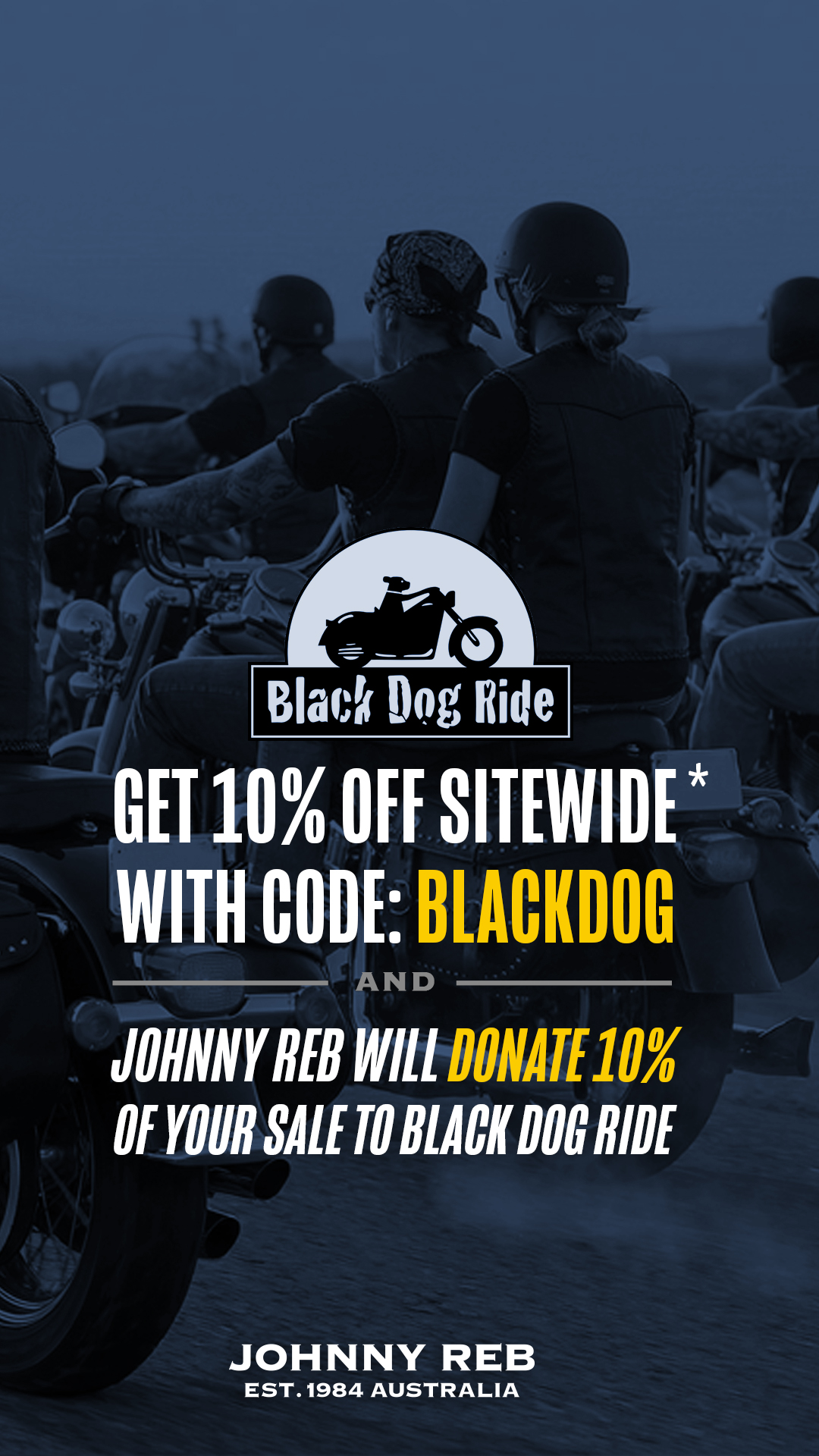 GET 10% OFF & WE'LL DONATE 10% - For the last few years we have been supporting this great cause, we hope all of you will get on board too. Black Dog Ride is a charity who's mission is to raise awareness of depression and suicide prevention. A cause that touches everyone in one way or another.